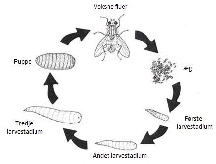 Larverne klækkes omkring 12 til 24 timer efter æglægning, og udvikler sig i løbet af 5 til 8 dage i gødningen, afhængigt af temperatur og gødningens næringsindhold. Forpupning varer endnu 3 til 4 dage.