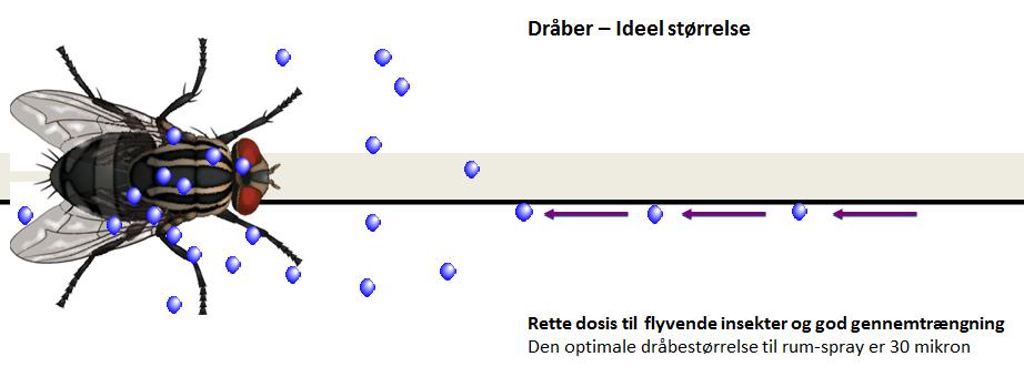 Den ideelle størrelse af dråberne til Space Spraying mod fluer er 30 µm.