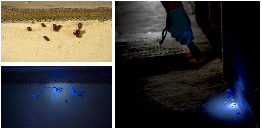Efter kontakt med den giftige lokkemad, vil gnavere efterlade glødende spor under ”sortlys” i